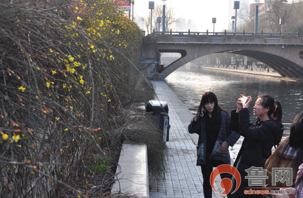 本周天气回暖,济南护城河边黄色迎春花开始盛开