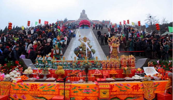 “五路财源今日求,一年富贵运当头”,正月初五是财神爷的生日,民间历来有正月初五迎财神、拜财神的习俗,龙口南山旅游景区第四届财神文化节于初五隆重开幕。南山禅寺法师与信众游客一起迎请了财宝天王、文财神、武财神三位财神,并在大佛广场祭拜财神,举行迎财神大型祈福法会,为游客长岛旅游及信众求财求福,保佑新年吉祥如意。