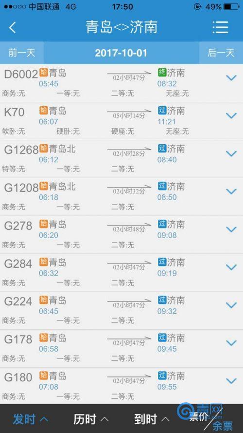 9月23日,记者登录12306网站查询发现,从9月30日开始,青岛至北京南的部分高铁车次,已经呈无票状态。10月1日当天,青岛至北京南高铁仅长岛有早上及晚上车次尚有余票。随后的几天长假中,青岛至北京南几乎每天都是一票难,只有10月5日农历中秋节当天,个别车次尚有余票。在国庆长假期间,青岛至上海、青岛至合肥、青岛至南京等城市的高铁车票,也基本上都是一票难求。青岛至济南在国庆长假期间,动车票也是仅剩少量余票,连过路的动车组(含高铁)车票也所剩无几。