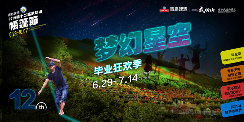 青春,阳光,武功山上!相约青岛啤酒2019第十二届武功山帐篷节“梦幻星空”毕业狂欢季,在武功山上留下美好的回忆和故事,爱上直播,引爆抖音,和更多人一起来分享,让每一段人生旅程都成为狂欢的盛宴。 活动咨询电话:0799-6682266 400-100-3331 咨询官方QQ:2230968094 报名通道:官方微信武功山(jxwgsjq) 活动官方微博:@萍乡武功山风景区