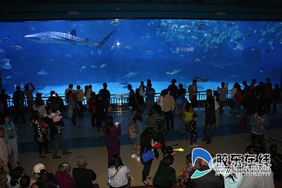 在鲸鲨展区,游客能欣赏到鲸鲨引领双髻鲨、燕鳐、鲎头鳐等30余种、3000余尾鱼类遨游在亚洲最大水族箱里,感受海洋鱼类霸主的王者风范!